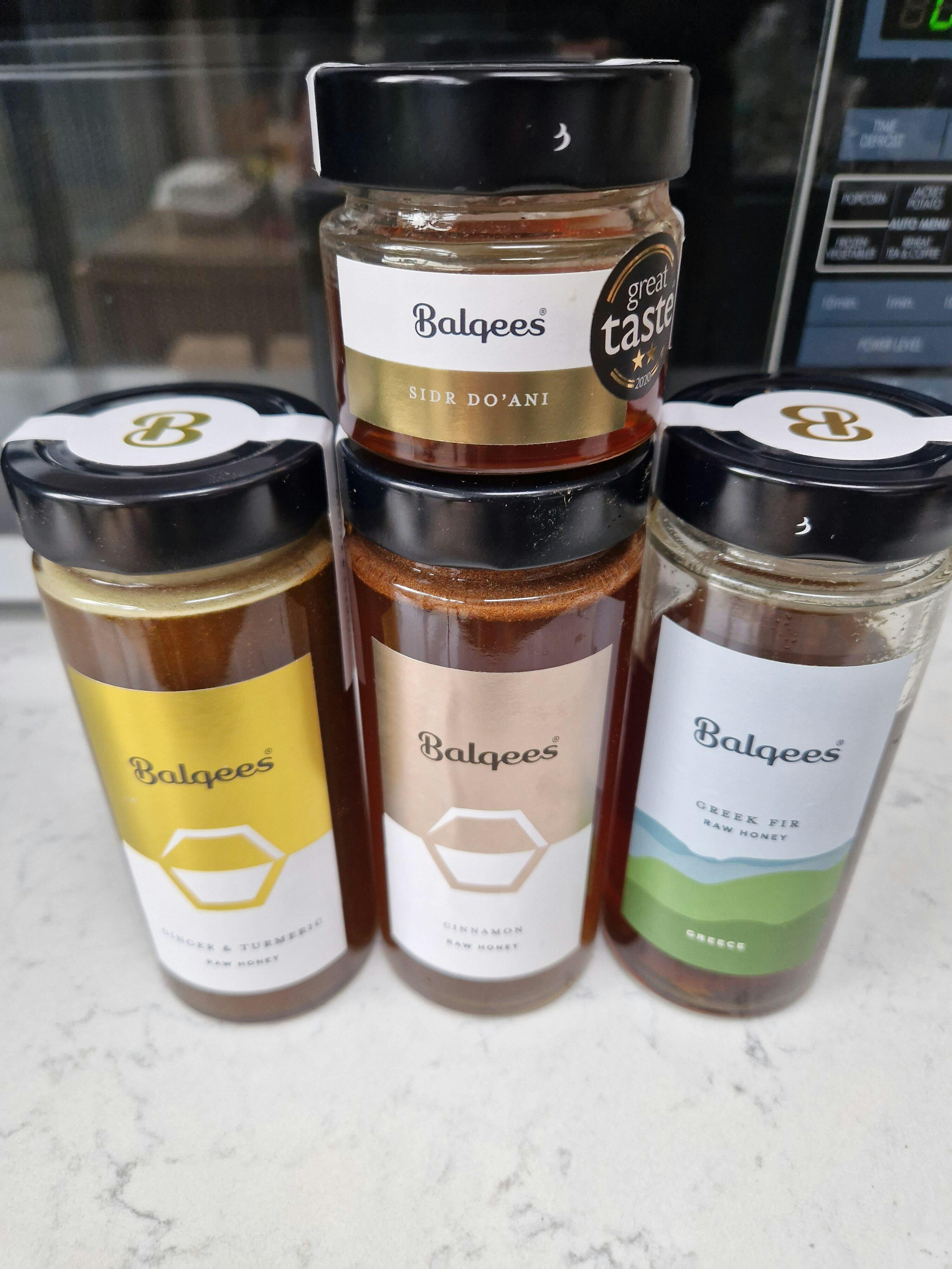 Packaging. All Balqees honey is packaged in recyclable glass jars.