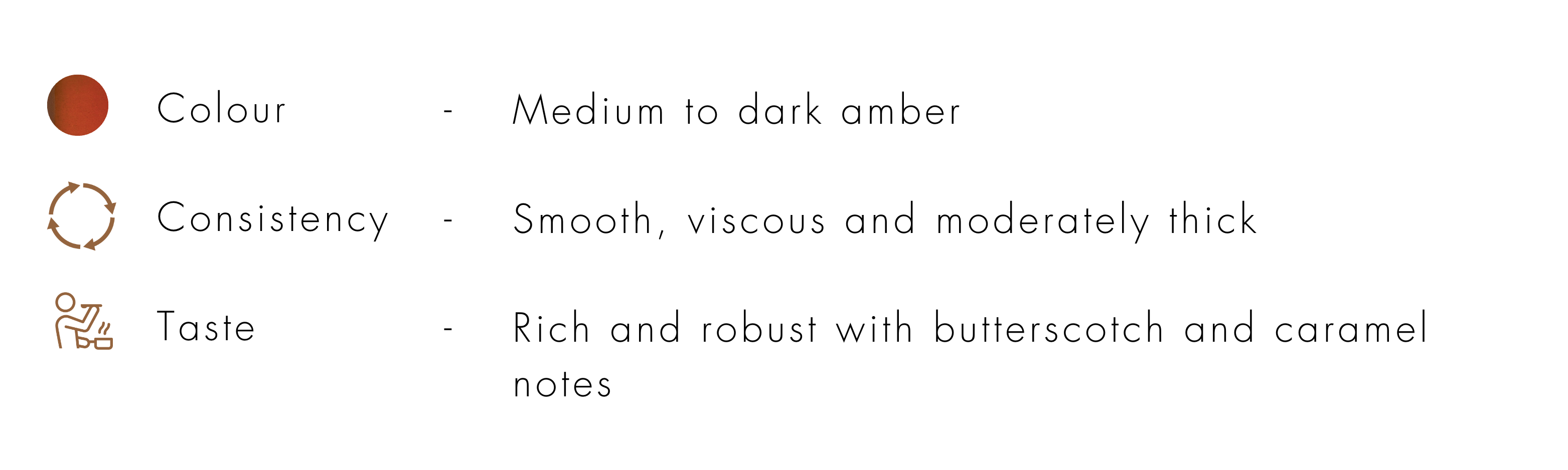 The colour, taste and consistency of each honey can vary slightly from harvest to harvest, as the nectar and pollen available for the bees to forage on varies throughout the seasons. This is the case with all varieties of single-origin honey since it is a natural product and not processed.